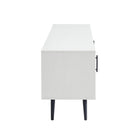 Improve your living room with a TV Stand featuring a middle shelf and closed storage on both sides for you to have a place for your media essentials or décor, whether in your living room or bedroom. The sleek metal hardware, angled legs, and boxy frame create an overall mid-century modern aesthetic. With a cord management feature in the back to keep things tidy, adjustable shelves, and adjustable rubber feet to prevent it from sliding, this storage console will make a practical addition to your home.