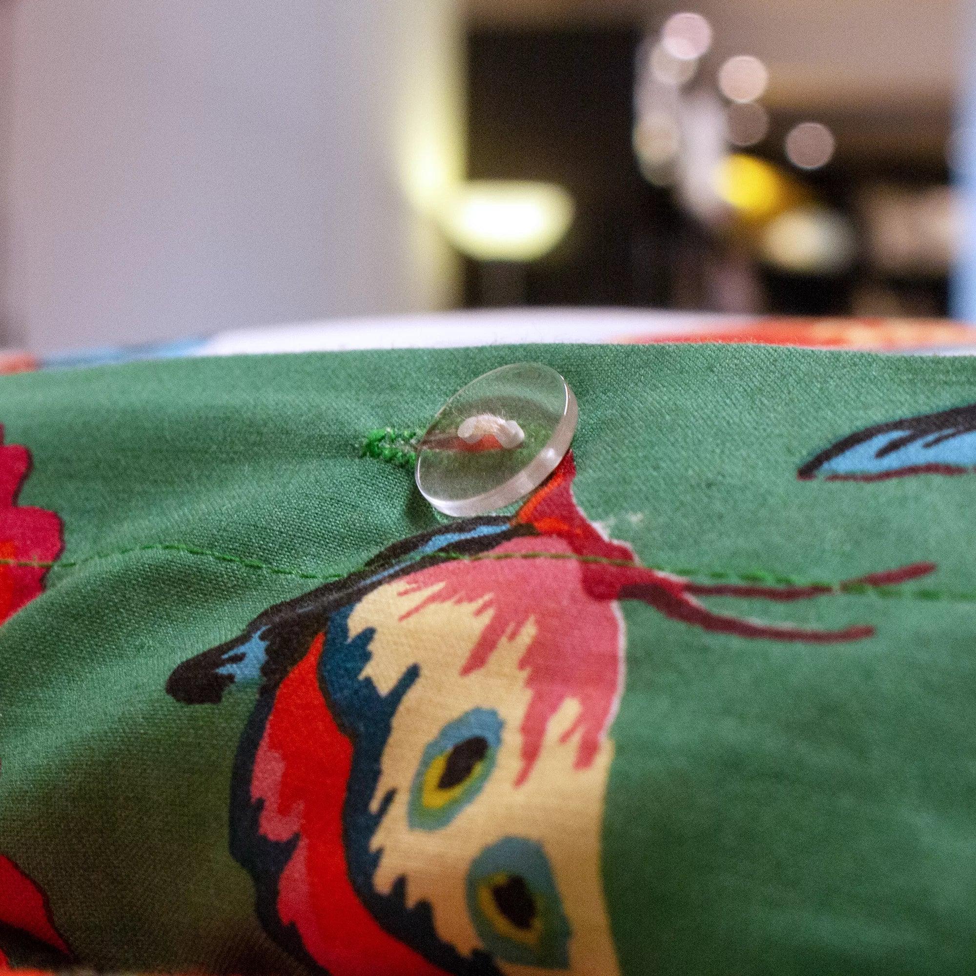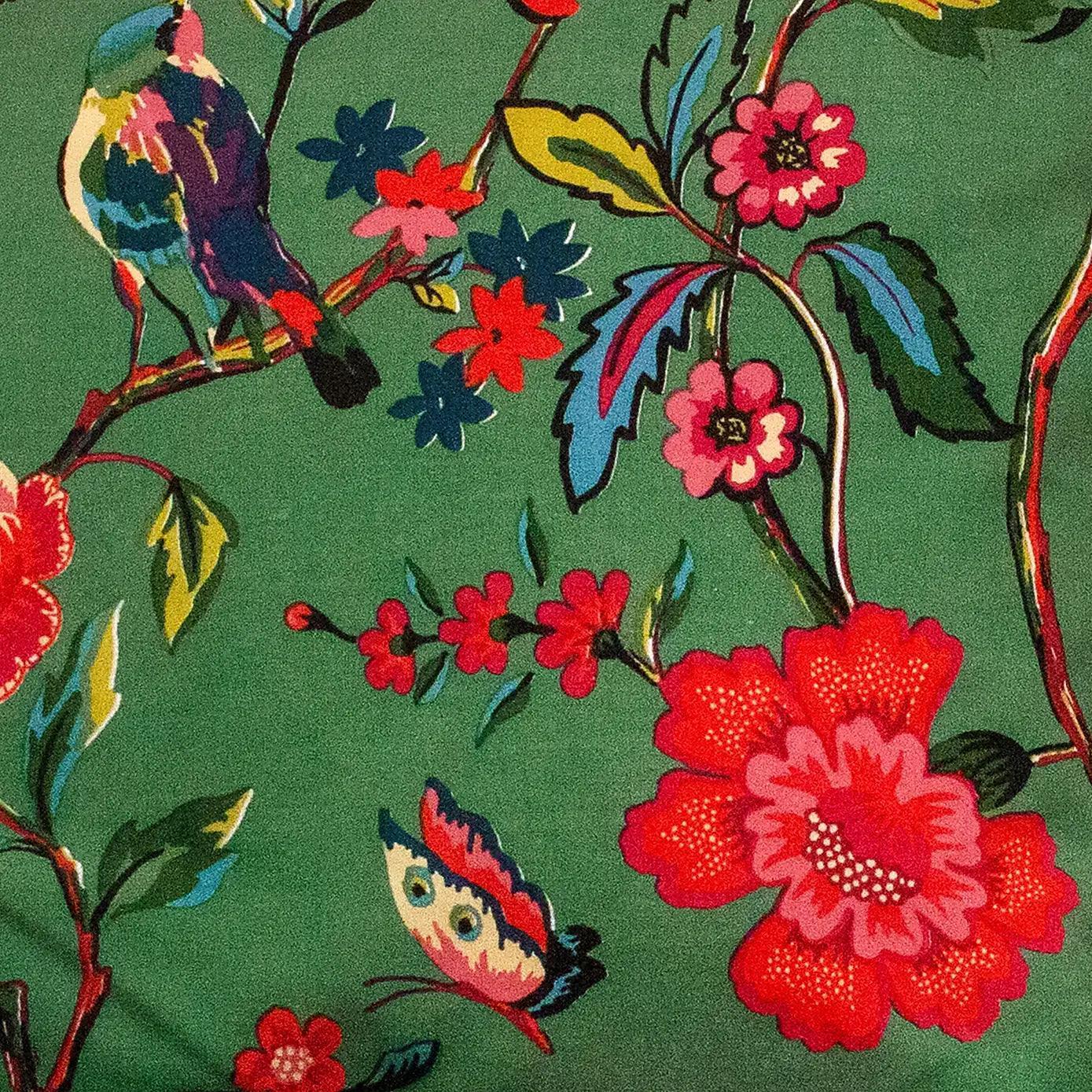 - Bright and colorful floral print featuring tropical birds with a white floral reverse
